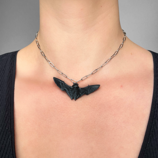 Affichez un style unique avec le collier "VLAD", mettant en scène une chauve-souris, symbole de renaissance et de protection dans de nombreuses cultures. Ce pendentif est fabriqué en résine de qualité et monté sur une chaîne ras du cou en acier inoxydable, alliant robustesse et élégance.